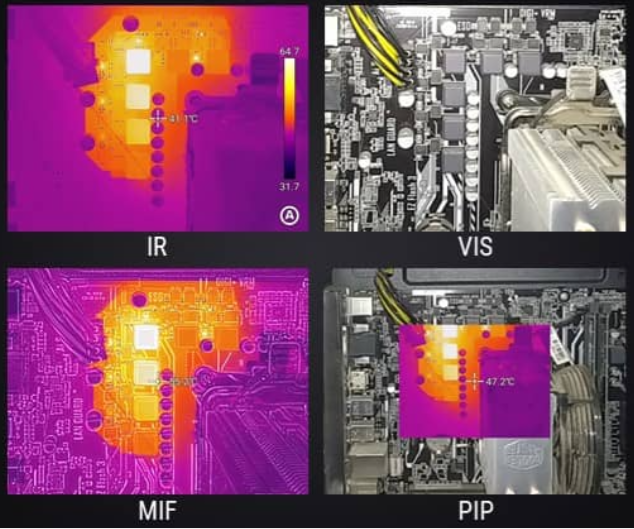 Các chế độ IR, VL, MIF và PIP cung cấp chế độ xem trực quan dữ liệu nhiệt độ mục tiêu và tự động hiển thị nhiệt độ cao nhất, thấp nhất và trung tâm của toàn màn hình